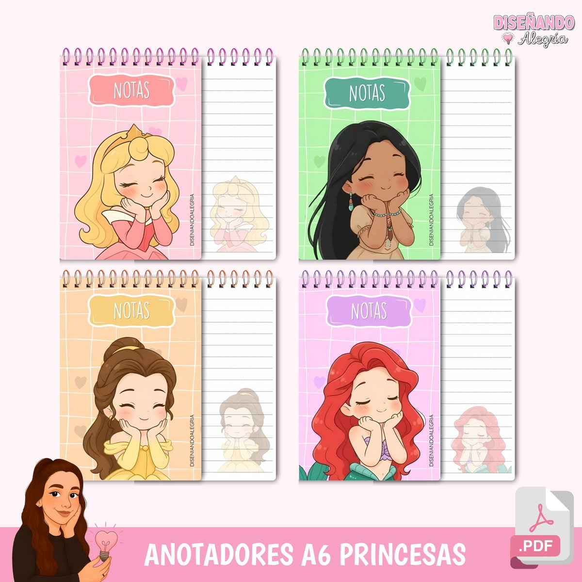 ¡Lleva la magia de las princesas a tu emprendimiento! Este pack digital está diseñado para que puedas ofrecer anotadores súper prácticos, tiernos y versátiles, optimizando al máximo tus materiales. Es la solución ideal tanto si trabajas con encuadernación tradicional como si buscas productos rápidos de armar.