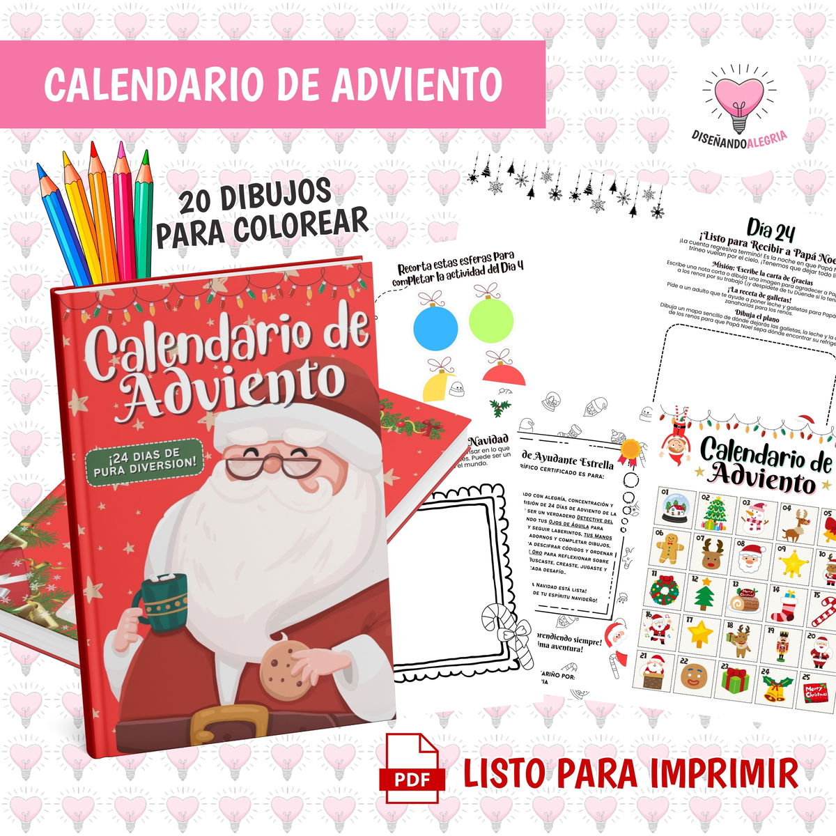 Este kit está lleno de ilusión y ternura. Incluye un Calendario de Adviento de 24 días con actividades repletas de diversión + Cartita para agradecer a Santa y sus ayudantes + Duende + Planchita de Stickers + Instructivo para las familias