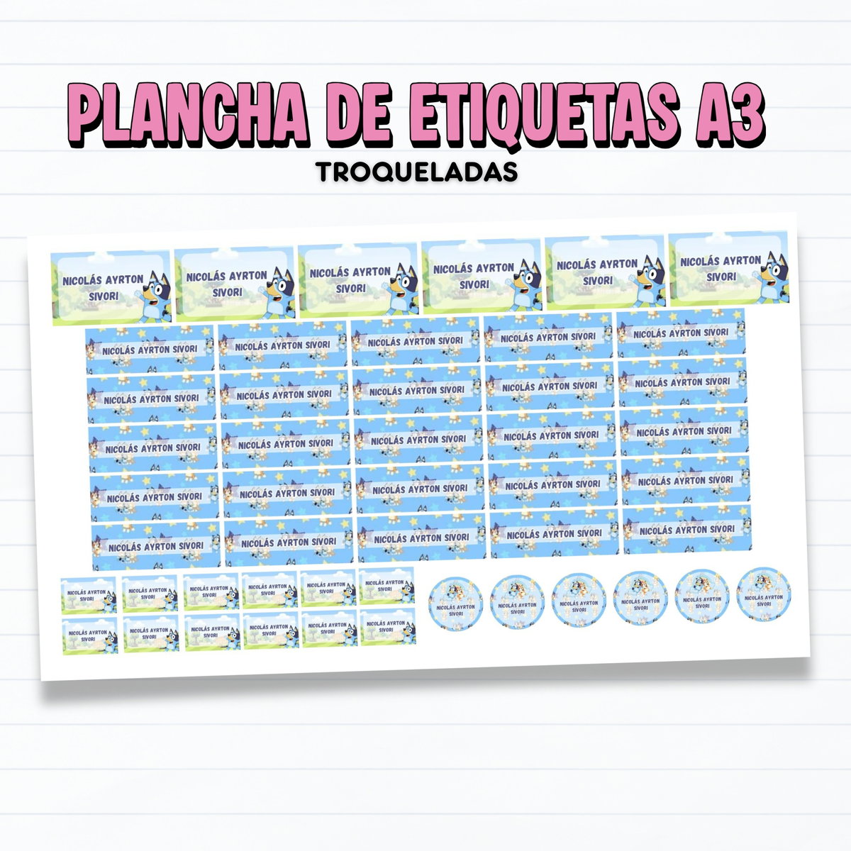 Plancha de etiquetas troqueladas, ideales para que los chicos puedan identificar sus utiles fácilmente.