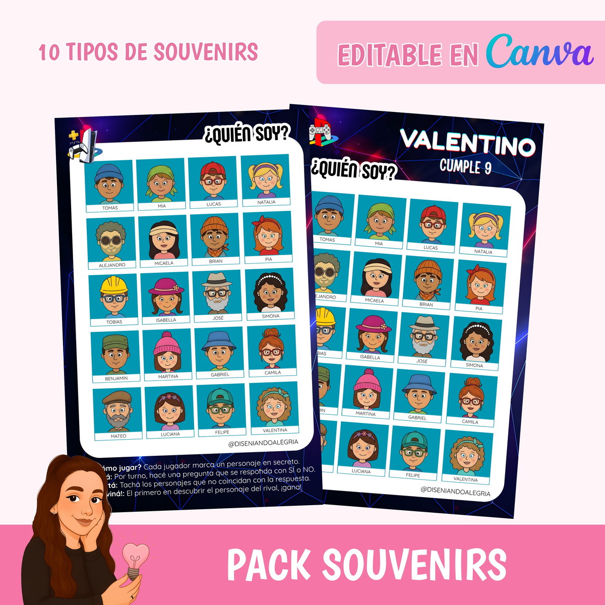 Entrega flash: Editás nombre y temática en Canva en 5 minutos y mandás a imprimir.